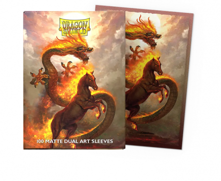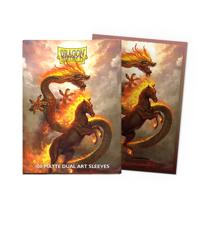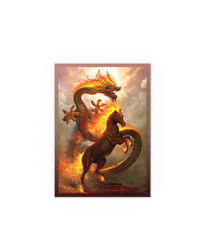 Let the unwavering spirit of the Fire Horse ignite your way to commanding victories. Featuring fiery artwork by Godfrey Escota these sleeves will set your resolve ablaze to charge into the Lunar New Year.