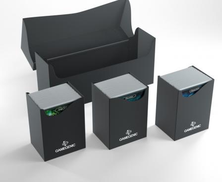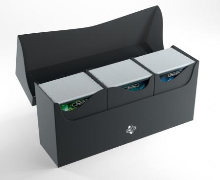 A protective box to store three complete decks or up to 240 double-sleeved cards. This durable box is a functional and affordable storage solution. The 3 inner deck holders are removable and can hold up to 80 double-sleeved cards each. The innovative Cobra Neck technology allows for wide opening of the lid and easy access to cards and deck holders.