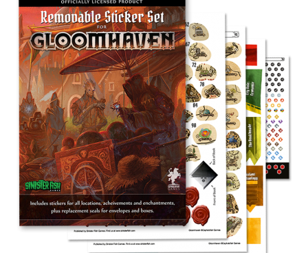 Removable vinyl stickers for all locations, achievements, and enhancements, plus replacement seals for envelopes and boxes.