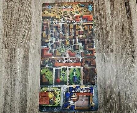 The Playmat is double-sided. One side is the "day" layout for competitive play. And the reverse is the "night" side with spaces for the Barricades board overlays, showing the Village partially destroyed. The "night" side is intentionally darker than the day side to reflect the perilous condition of the Village!