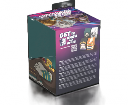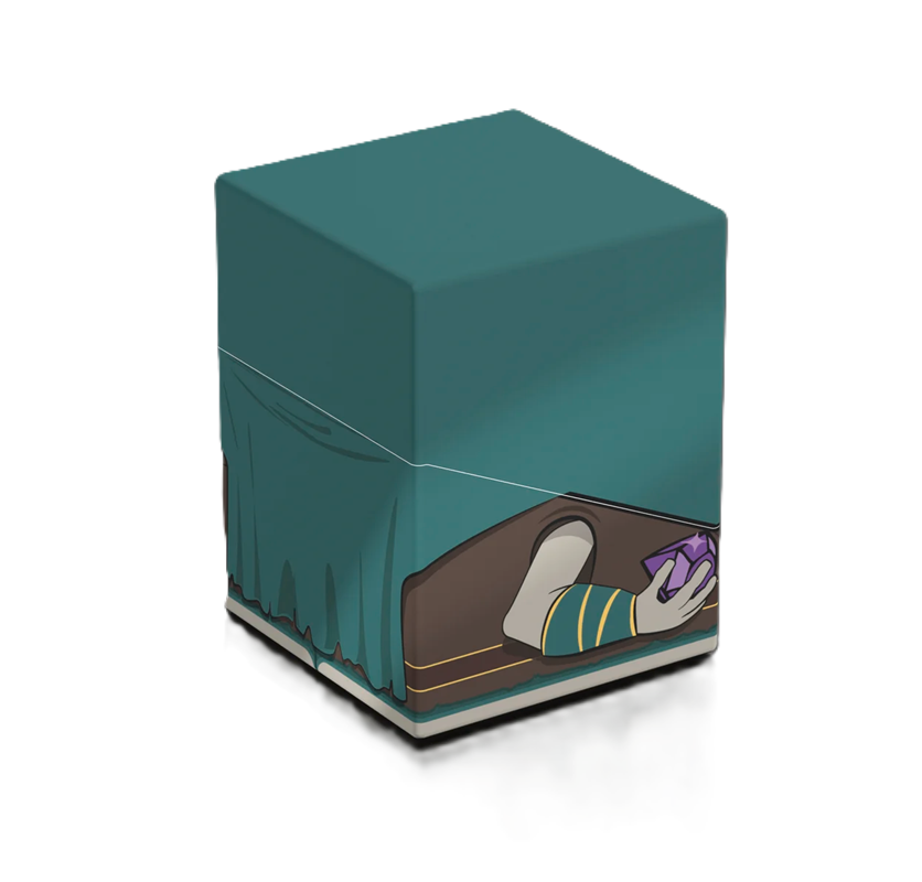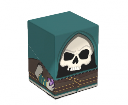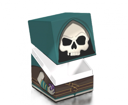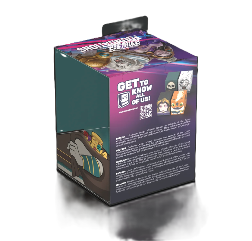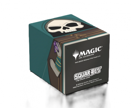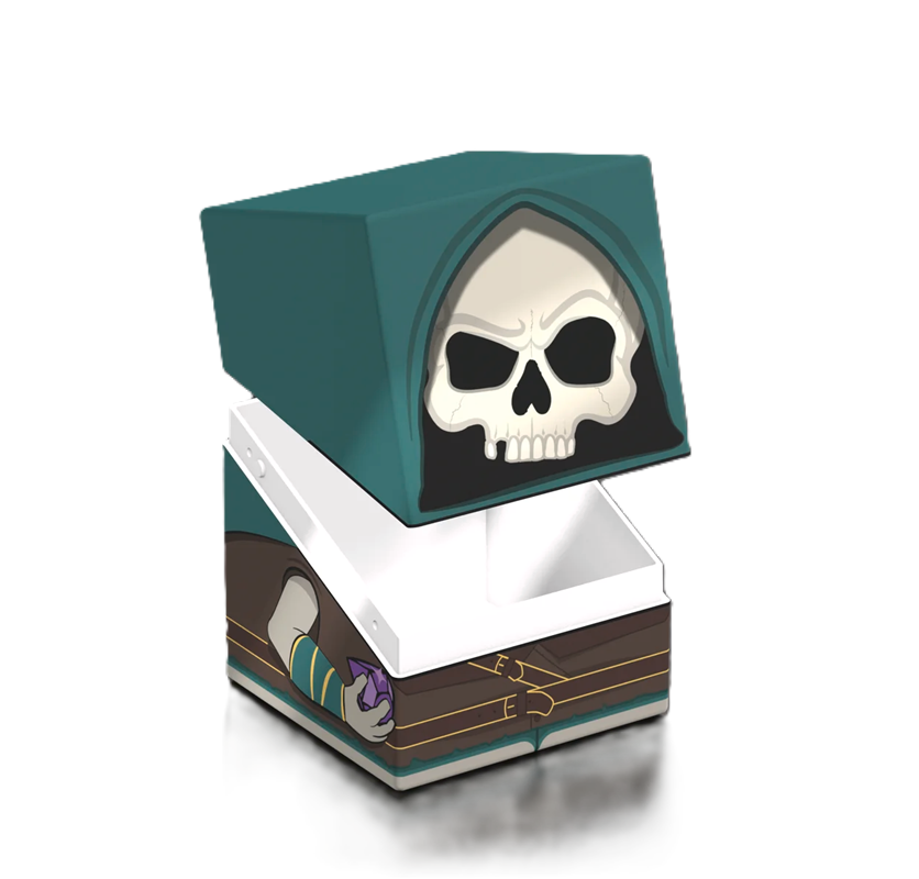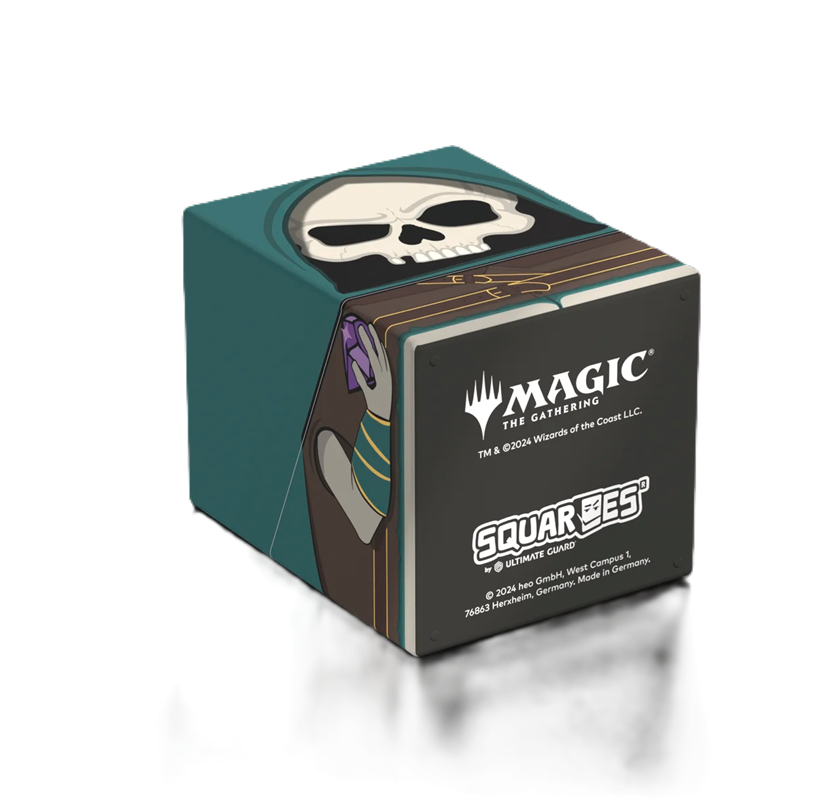 Collectible box for storing your deck, tabletop gaming accessories, and/or collectibles. The Tinybones Squaroe from the Magic: The Gathering edition holds up to 100 cards in double protective sleeves if used as a deck box. Squaroes are made from 78% renewable resources.