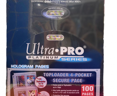 The Toploader 4-Pocket Secure Page is the newest addition to the Ultra PRO Premium Hologram Pages Line. This page features a protective flap for each pocket to secure contents in place and keep dust & dirt out. Each page holds up to 4 cards stored in up to 130pt Toploaders. Pages are clear and fit in our standard-size 3-ring albums. You’ll know it’s Ultra PRO quality with the hologram seal on the spine. Now you can store and display your favorite sports card hits or Pokemon and MTG pulls easily in the binder of your choice. Easily flip through trades, or bring your collection neatly stored in 3-ring binders to your next collectibles event.