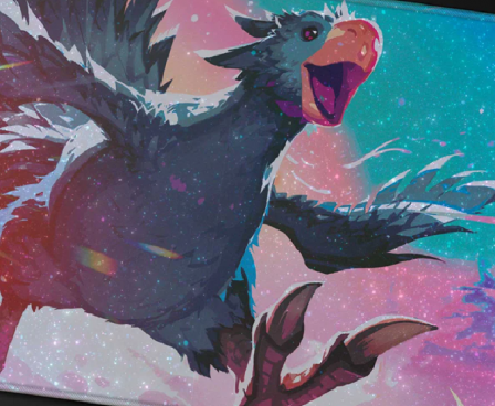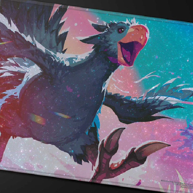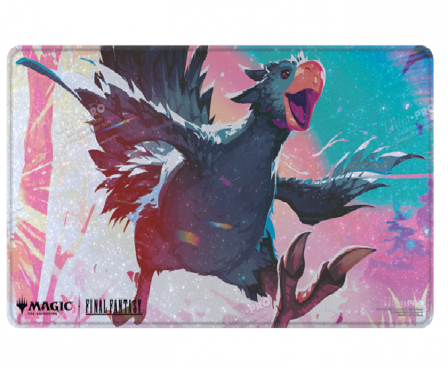 Holofoil Playmats (patent pending) feature popular Magic: The Gathering—FINAL FANTASY Traveling Chocobo (Black) artwork on a shiny holofoil printed material, and enhance your gameplay experience! Each playmat is made with a soft fabric top to reduce damage to cards, and the non-slip rubber backing keeps the playmat from shifting during use. With dimensions of approximately 24 in. x 13.5 in., a playmat also makes an excellent oversize mousepad for home or office.
