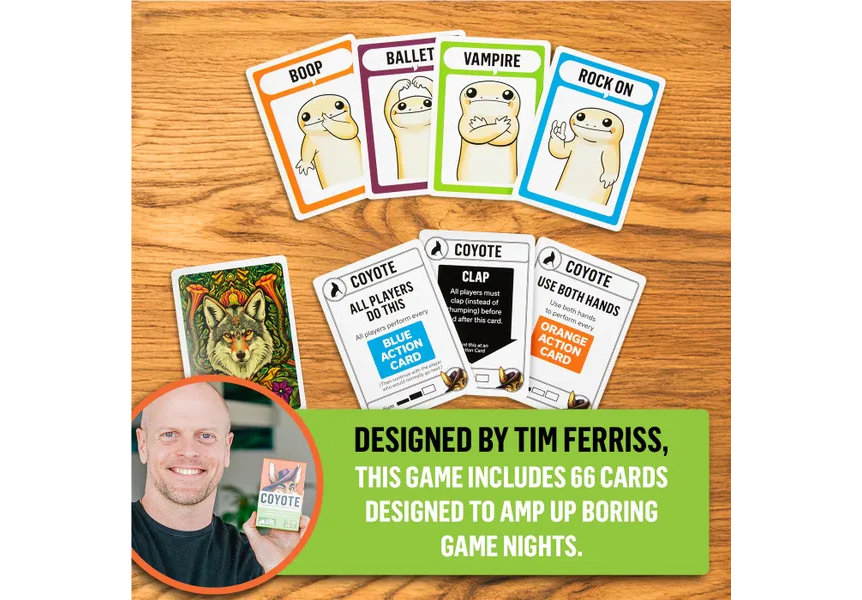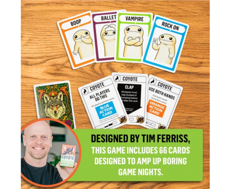 Each card has an action and a word. Lay out a line of cards and take turns, performing and saying each card. Add “coyote” cards to sabotage the other players and make the game harder. Mess up the sequence, and you're out.