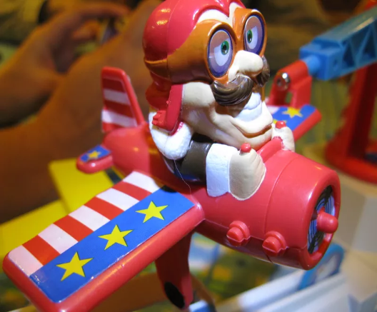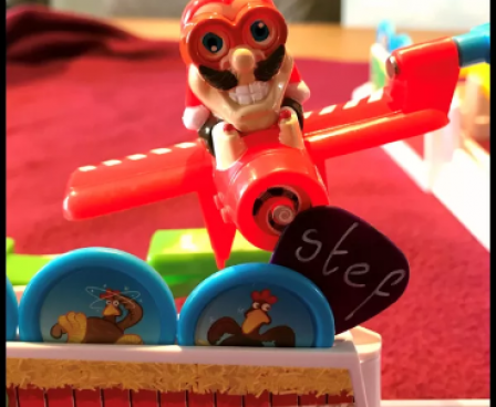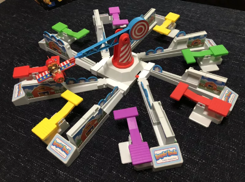 In Loopin' Louie, a battery-powered motor placed in the center of the table rotates a boom with a little plastic plane. Four radial arms lead out to the players' barns and the chickens they're trying to protect. Each barn has a little lever, which is used to knock the rotating plane away from your chickens and hopefully into someone else's. When only one player has chickens remaining, he or she wins the game. Very silly and very addictive.