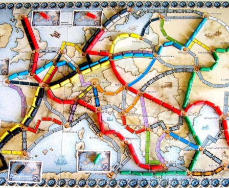 More than just a new map, Ticket to Ride: Europe features brand new gameplay elements. Tunnels may require you to pay extra cards to build on them, Ferries require locomotive cards in order to claim them, and Stations allow you to sacrifice a few points in order to use an opponents route to connect yours. The game also includes larger format cards and Train Station game pieces.