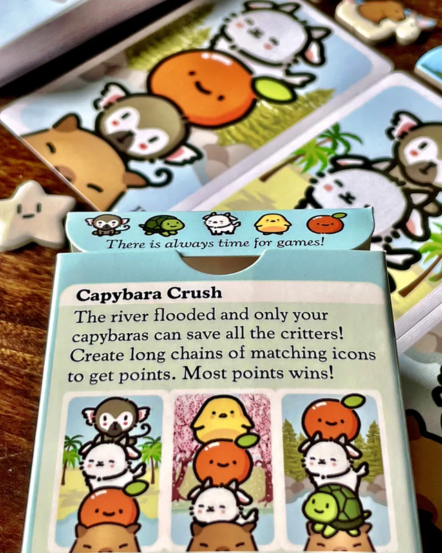 Addicting fun card game! Help critters escape the flooding river with your herd of of Capybaras. Form long interweaving chains of matching critters and backgrounds to score points. Most points wins.