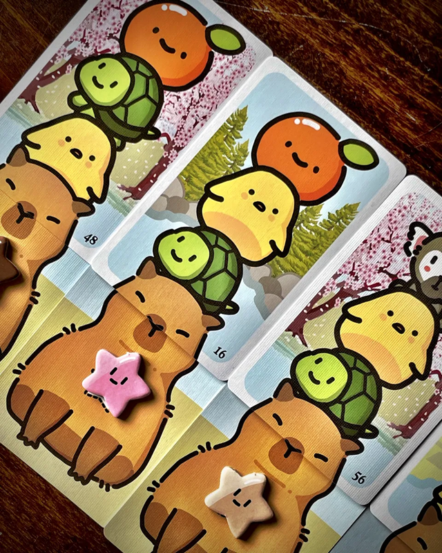 Each card has a column of three different critters on the front and a capybara on the back. Either place the critters on one of your capybaras, or add a capy to your roster.