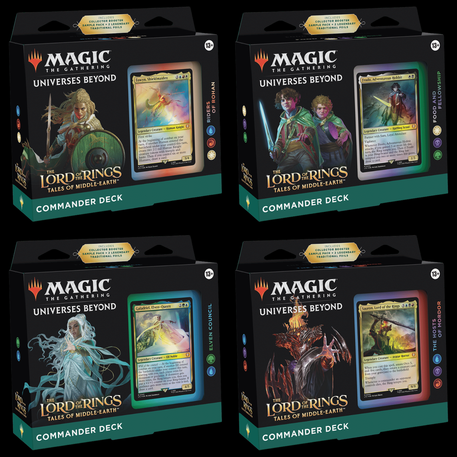 - Contents—1 ready-to-play The Lord of the Rings: Tales of Middle-earth Commander Deck (includes 2 Foil Legendary cards), a 2-card Collector Booster Sample Pack, 1 Foil-Etched Display Commander, 10 double-sided tokens, 1 Helper card, 1 life tracker, and 1 deck box