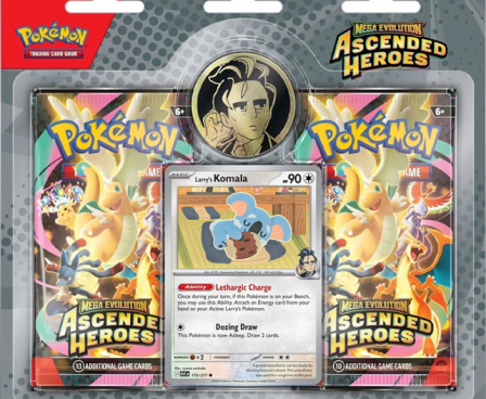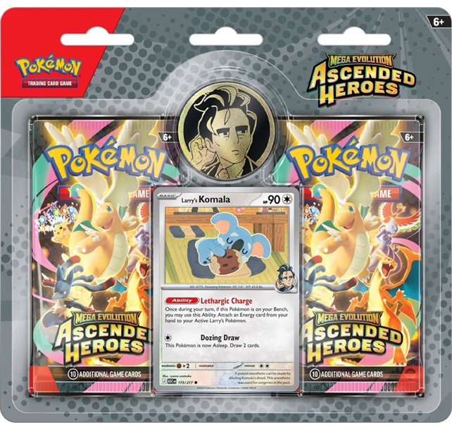 The Celadon City Gym, led by Gym Leader Erika, is filled with beautiful greenery and Grass-type Pokémon galore. Visitors to Medali in the Paldea region have the chance to battle Gym Leader Larry and his Normal-type Pokémon. In this collection, you’ll find a promo card featuring either Erika’s Tangela or Larry’s Komala, a metallic coin featuring your chosen Gym Leader, and two booster packs from the Mega Evolution—Ascended Heroes expansion.