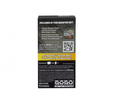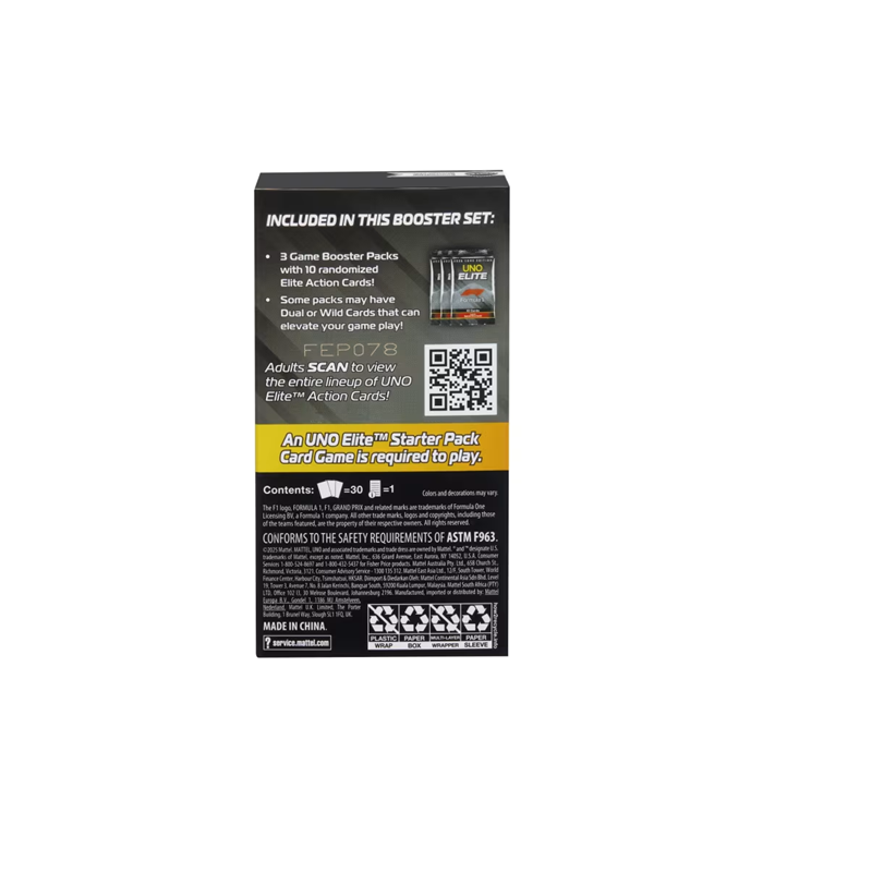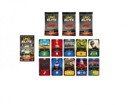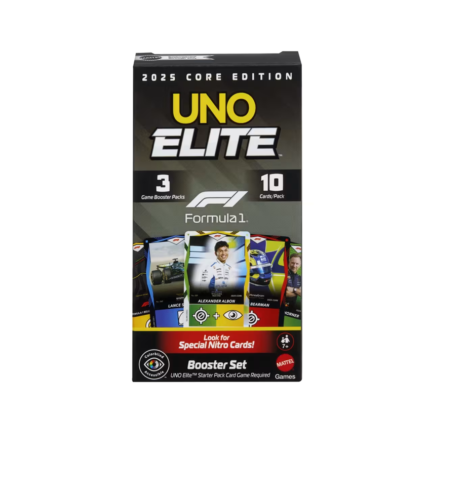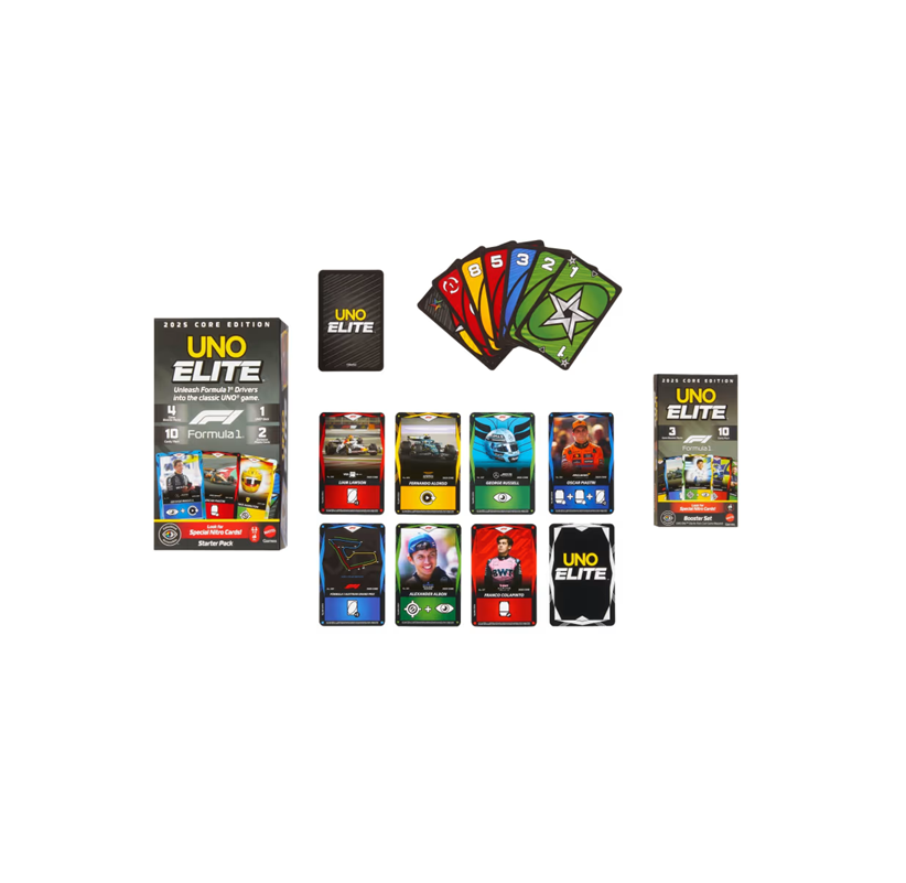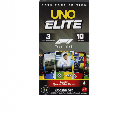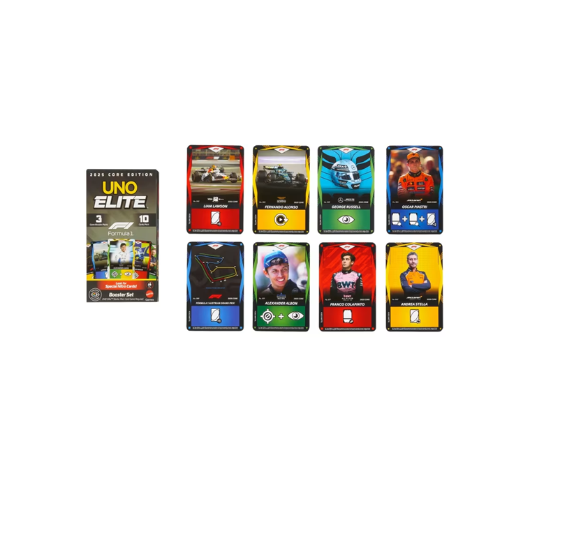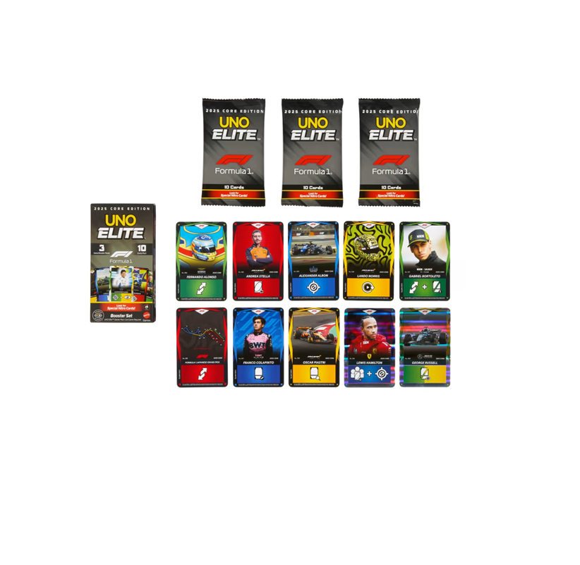 Add the cards from the UNO Elite Formula 1 2025 Core Edition Booster Set to an UNO Elite Formula 1 card game to get the race going! Each set includes three Game Booster Packs, each with 10 Elite Action Cards for a total of 30. Which ones will you get? Each Elite Action Card comes with its own special power that activates when a game player plays a card with an Elite icon on it. And when down to the last card, don’t forget to yell “UNO!” The racing-themed game makes a thrilling gift for Formula 1 fans and card game lovers ages 7 years old and up. Colors and decorations may vary.
