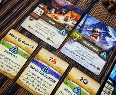 To play a card, you must pay the listed cost of resources. If it is a Critter, you may instead play it for free by using 1 of your 2 Chimneys, so long as you have the necessary Fire to light it. Cards may be played either from your hand, or from the area of face-up cards on the board known as the Valley. Nearly all of the cards in Silverfrost feature new and powerful abilities, offering a huge variety of strategic depth and combos to explore.