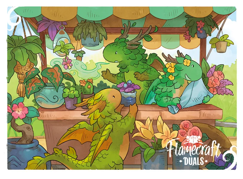 Ever wondered what the dragons of Flamecraft do on their lunch break? Play Flamecraft Duals, of course! Set in the world of Flamecraft, Duals is a two-player travel-friendly game of pattern-making and quick, puzzly fun! You will meet the artisan dragons again with new powers, and this time the challenge is to get your dragons in a row. As you draw dragons, you might get lucky and come across a rare dual-colored Hydragon, with double the artisanal skills! As you play, the board will fill up with adorable dragons, stacking and soaring across the table, and you will work to fire-up their abilities, make matches, and complete shop cards.