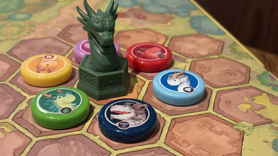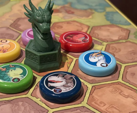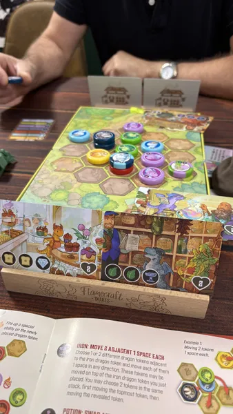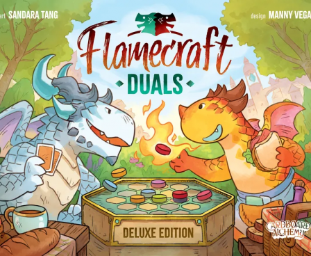 Flamecraft Duals is a two-player abstract pattern-building game that takes about 30 minutes to play. Each round, a player draws a dragon from the bag and places it on the shared central board. Every dragon type has a special ability that can be fired up to draw more dragons or rearrange those already on the board. You want to match three dragons on the board to the pattern on the shop cards in your hand to score them. Once all the dragons are drawn from the bag, the game ends and the player with the highest score wins.