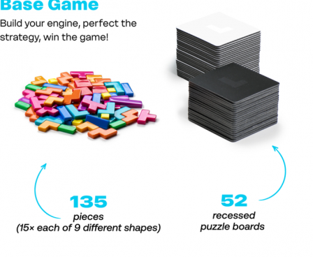 The core of the game lies in using your pieces to complete puzzles. Starting with just two basic pieces, you use three actions every turn to develop a powerful engine. With more pieces of various types, you can efficiently complete even the most difficult puzzles. The puzzles you complete award you points or new pieces to further fuel your engine.