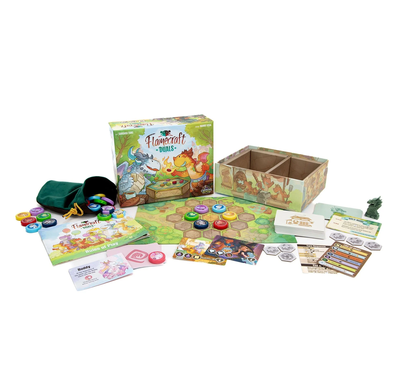 Ever wondered what the dragons of Flamecraft do on their lunch break? Play Flamecraft Duals, of course! Set in the world of Flamecraft, Duals is a two-player travel-friendly game of pattern-making and quick, puzzly fun! You will meet the artisan dragons again with new powers, and this time the challenge is to get your dragons in a row. As you draw dragons, you might get lucky and come across a rare dual-coloured Hydragon, with double the artisanal skills! As you play, the board will fill up with adorable dragons, stacking and soaring across the table, and you will work to fire-up their abilities, make matches, and complete shop cards.