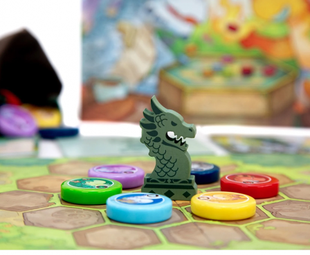 Flamecraft Duals is a two-player abstract pattern-building game that takes about 30 minutes to play. Each round, a player draws a dragon from the bag and places it on the shared central board. Every dragon type has a special ability that can be fired up to draw more dragons or rearrange those already on the board. You want to match three dragons on the board to the pattern on the shop cards in your hand to score them. Once all the dragons are drawn from the bag, the game ends and the player with the highest score wins.