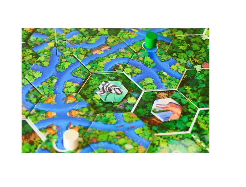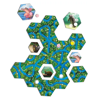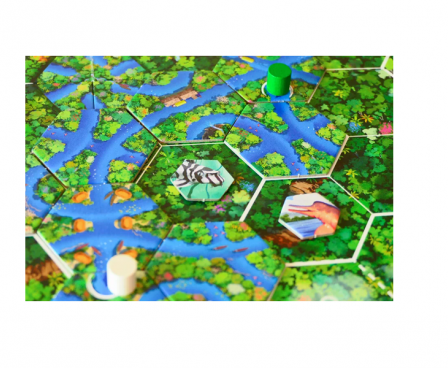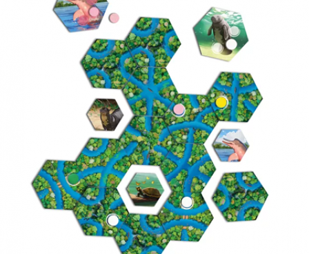 Flow: Untamed Rivers is a strategic tile-laying game in which players take turns placing a tile on the rainforest board. This gradually forms a river labyrinth, in which you always have to be attentive so that you don't miss a chance for yourself or overlook one of your fellow players. Each player has only 3 Lair Tiles, which can be used to build Territories. Therefore, it is important to carefully weigh up when to use them and when it is better to wait. However, if you wait too long, it can be too late and you end up with only one or two Territories. In addition, each player has one Reservation Marker, which reserves a field of the rainforest board until the end and can be worth its weight in gold if placed on the right field.