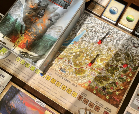 Siberian Manhunt is an asymmetrical hidden movement game for two players. One player takes the role of a U-2 spy plane pilot who has crashed behind enemy lines and must escape across the border into China. The fugitive must use their wits to navigate the dangerous landscape, survive encounters with predatory animals, and avoid starvation and hypothermia, all while being pursued by the KGB. Do they dare enter towns, risking detection by the local authorities, or will they strike out into the wilds and rely on their wilderness survival skills to stay alive?