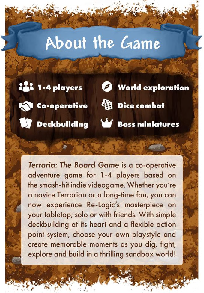 Terraria: The Board Game is a co-operative adventure game for 1-4 players. Whether you’re a novice Terrarian or a long-time fan, you can now experience Re-Logic’s magnum opus on your tabletop, solo or with friends. With simple deckbuilding at its heart and a flexible action point system, choose your own playstyle and create memorable moments as you dig, fight, explore and build in a thrilling sandbox world!