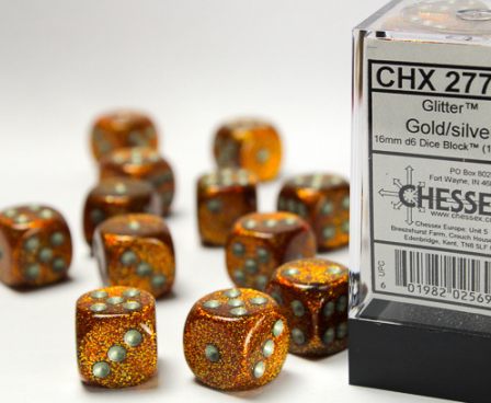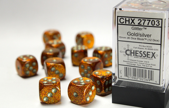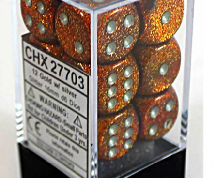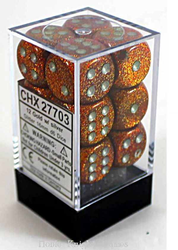 Each set contains 12 Glitter Gold 16mm d6 dice with silver pips