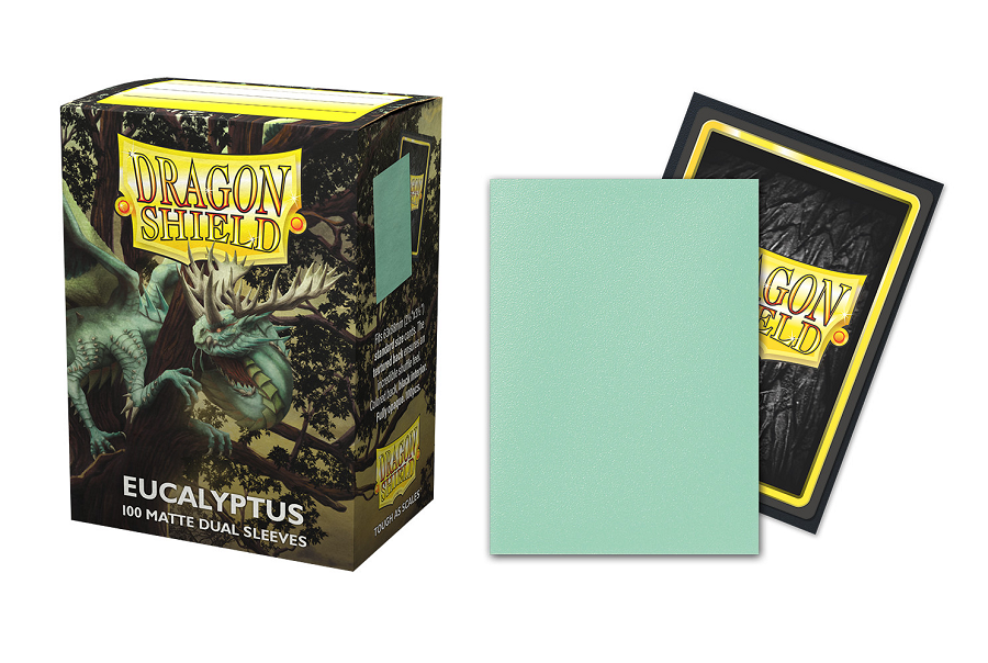 Dragon Shield Dual Matte sleeves. Clear front and a textured matte back. Fully opaque sleeves with a black interior, an elegant backdrop for black bordered cards.