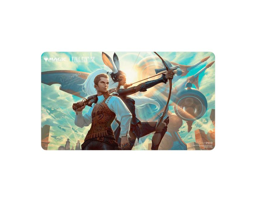 Playmats feature popular Magic The Gathering FINAL FANTASY Balthier & Fran artwork and enhance your gameplay experience! Each playmat is made with a soft fabric top to reduce damage to cards, and the non-slip rubber backing keeps the playmat from shifting during use. With dimensions of approximately 24 in. x 13.5 in., a playmat also makes an excellent oversize mousepad for home or office.