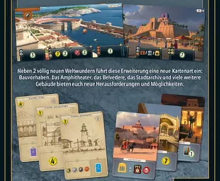 In more detail, this expansion contains fifteen edifice cards: five each in ages I, II, and III. To set up, choose one card from each age at random, then place it project side face up on the table and place 2-5 participation markers on each card, depending on the number of players. The project side lists both the potential reward and potential penalty.