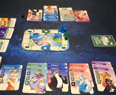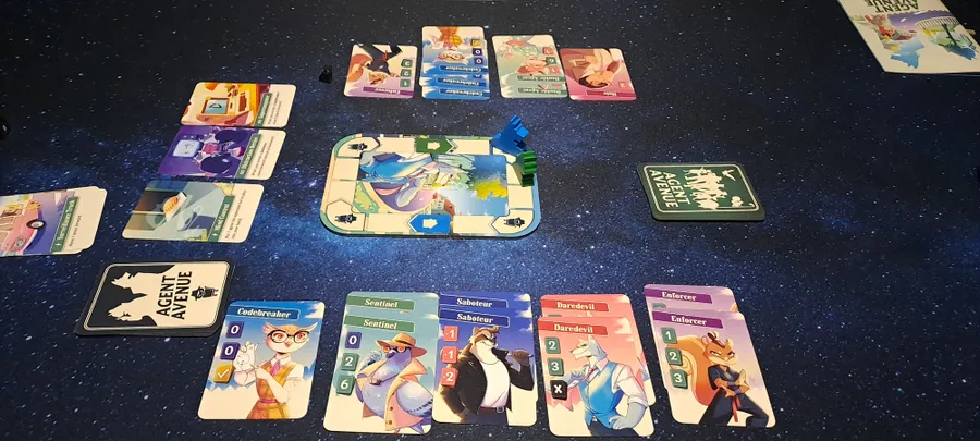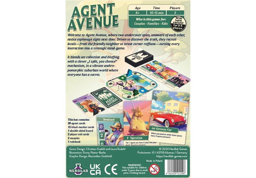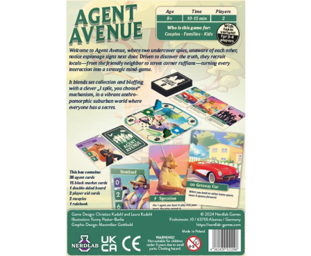 Agent Avenue is a competitive card game that combines bluffing, strategic set collection, and a race to uncover your opponent's identity. Set in a colorful anthropomorphic world, players assume the roles of retired spies in a suburban neighborhood, outsmarting each other with cards that can score points or trigger special effects. The game's art brings to life a quirky neighborhood of animal spies.