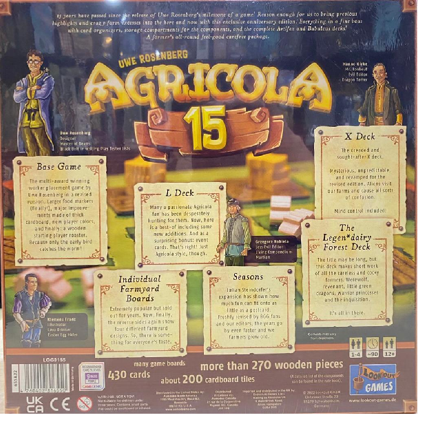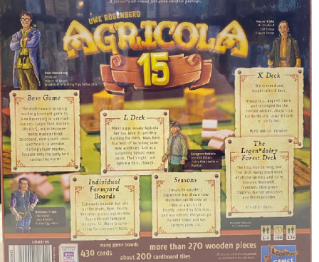 Agricola 15 celebrates the 15th anniversary of Uwe Rosenberg's Agricola by packing a lot of material created since the game's debut into a single XXL box: the revised edition of the Agricola base game, the complete Artifex and Bubulcus expansion decks, promo items that were previously long gone (adapted to go with the revised edition), some novelties (and no, you don't have all the L-Deck cards yet...), and a well-organized inlay for quick set-up and storage.