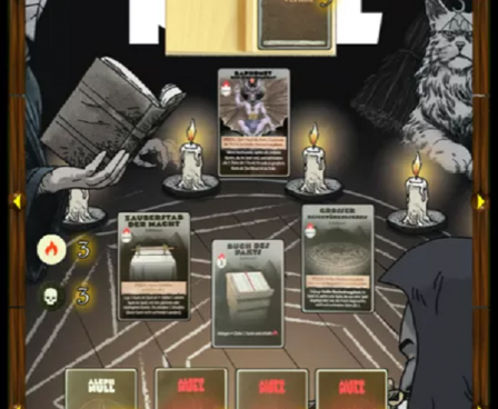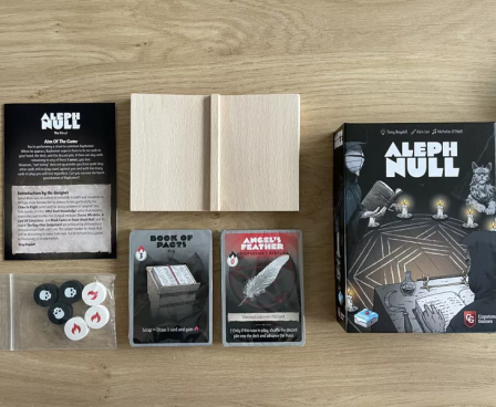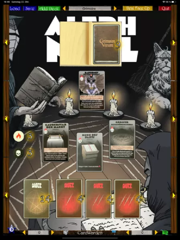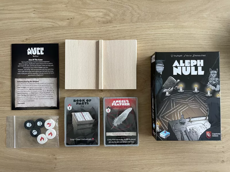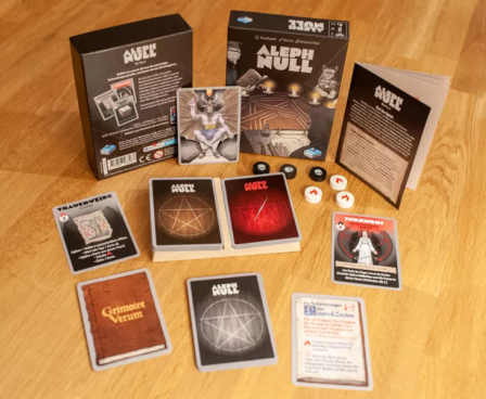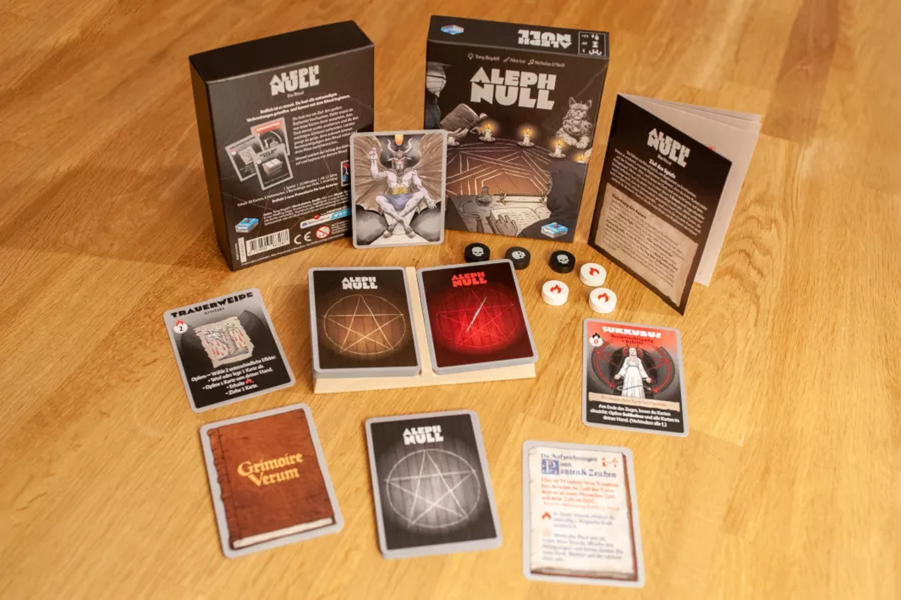 Inspired by the Black Easter novellas by James Blish, the aim of Aleph Null is to successfully summon the demonic Prince Baphomet who, when he appears, expects there to be no cards in your hand, the main deck and the discard pile; if there are any cards remaining in these ‘zones’, you lose. However, ‘not losing’ in this way doesn’t mean that you have won: any cards still in play also count against you – too many and you shall lose also. The sooner you ‘win’, the better your chance of surviving any due punishment.