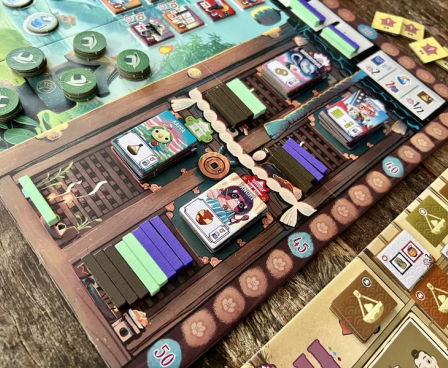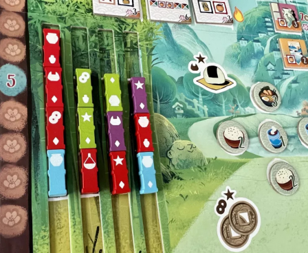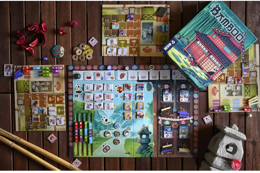 Bamboo games are made up of 4 years or rounds, which in turn are divided into 4 phases or seasons. On their turns, players will burn incense in temples to seek favor from the spirits, and use bamboo shoots to perform actions such as seeking balance, cooking, home improvement, or managing finances.
