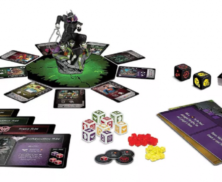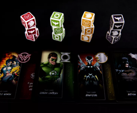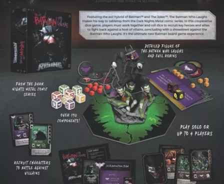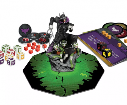 Players roll dice and work together to save the multiverse, starting with one of four starting heroes — Wonder Woman, Green Lantern, Hawkgirl, or Batman — and recruiting allies such as Harley Quinn, The Flash, and Cyborg, whose skills can complete objectives or help recover what is lost to darkness. Take out villainous versions of Batman such as The Merciless, The Dawnbreaker, The Murder Machine, and more before facing off with the psychotic Joker-ized antagonist himself, who's represented by a custom-sculpted, full-color figure who commands a fistful of chained Evil Robins!