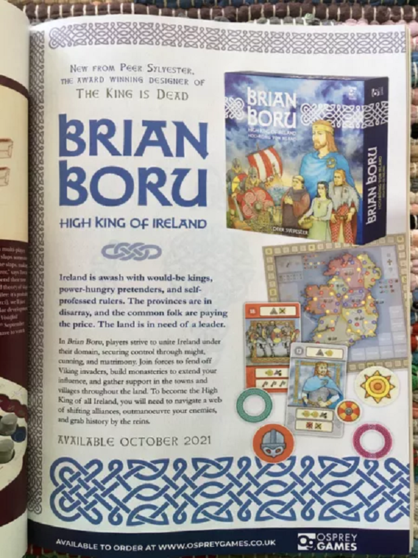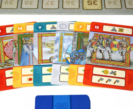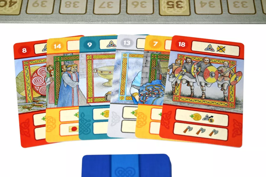 The success of the historical Brian Boru rested on three pillars: his victories against the Vikings, the favor he managed to garner with the Church, and the alliances he forged through political marriages. This became the foundation of the game, with each pillar becoming a suit in the trick-taking that forms the core of the mechanisms. Win a trick and you gain influence in a town, which, in turn, gains you majorities in the regions; if you lose the trick, however (deliberately or otherwise), you instead take an action corresponding to the suit of the card.