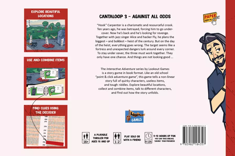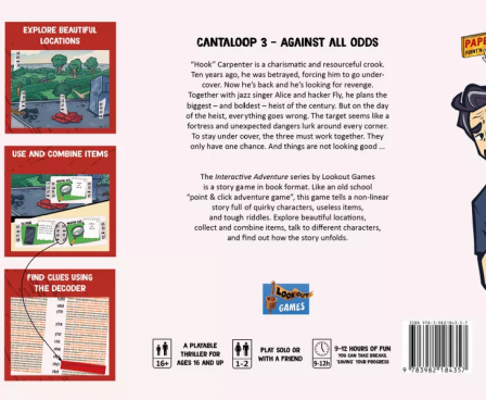 1-4 Players 360-720 Playing Time You got a plan and a team! Part 3 of the Cantaloop trilogy continuous exactly where "A hack of a plan" ended. "Hook", "Fly" and Alice are ready to execute their plan against the biggest crook of town. Use the unique abilities of your team and finally get your well deserved revenge. A dish, best served warm... wait, no. Wasn't it cold!? Explore beautifully illustrated locations, talk to characters and solve tricky puzzles in this "Point'n'Click" like game. Search and collect items, figure out where to use them and combine them with each other. Do you have what it takes? Find out in Cantaloop - An interactive adventure book!