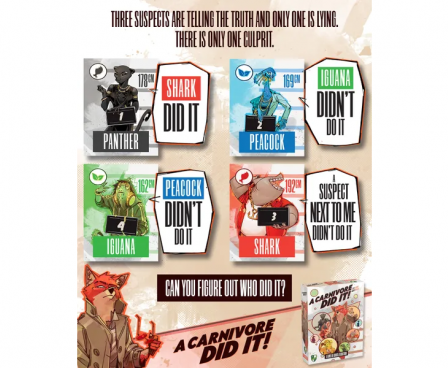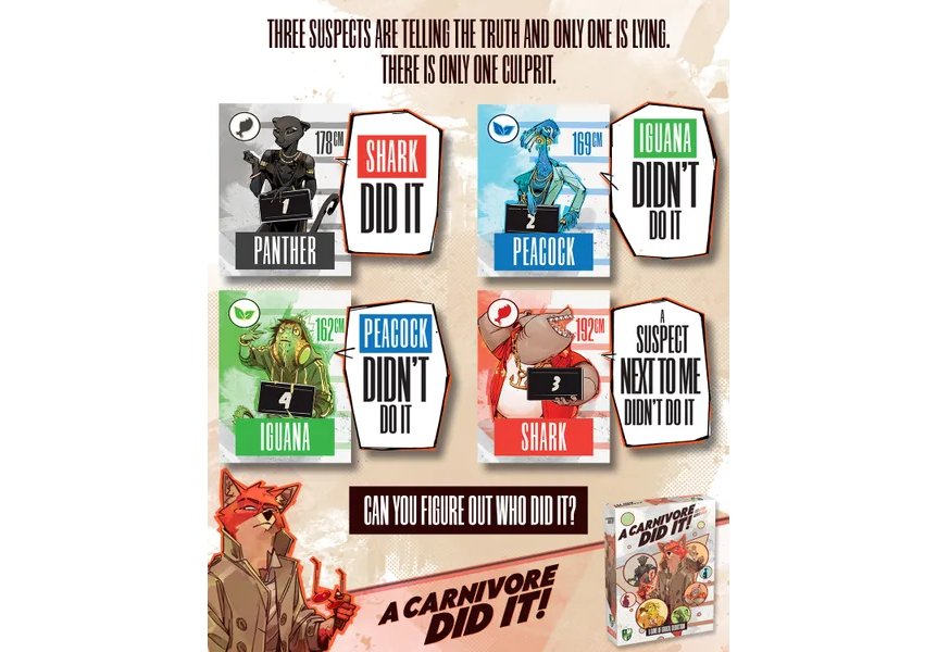 For each case in this co-operative game, you're given a number of suspects, with each suspect being assigned a statement, e.g., "Shark is telling the truth" or "A carnivore did it". You know how many culprits you're looking for, and you have some idea of how truthful everyone is being. Perhaps only one suspect is lying, or perhaps 3-4 of them are telling the truth. Putting all of this information together, can you determine who did the crime?