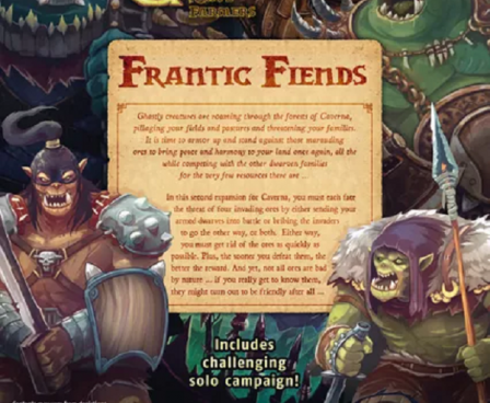 In Caverna: Frantic Fiends, the second large expansion for Uwe Rosenberg's Caverna: The Cave Farmers, you have to face these hostile plunderers. Luckily, you can either use your proven axes to teach them a lesson or build traps to keep them away from the cave entrances altogether. You can even push them into these traps with stone or bribe them with wood to weaken their strength. Defeating orcs will bring precious rewards, but if you fail to drive them off, all your plans might be in jeopardy.