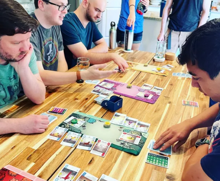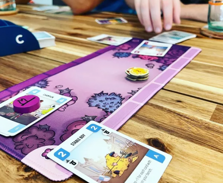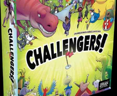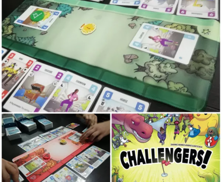 Challengers! is an interactive deck-management game for 1-8 players that plays in about 45 minutes independent of player count. With the tournament gameplay style, you meet another opponent every round.