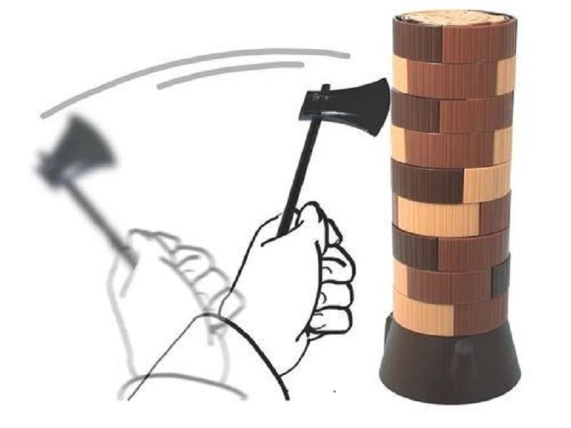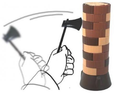 A very simple dexterity game with 12 large wooden discs, a wooden axe, and a die. The discs are stacked as a tower. A player turn consists of rolling the die and then hitting the tower with the axe. For example, if you roll a five, you have to hit the fifth disc five times with the axe. The player causing the tower to fall loses.