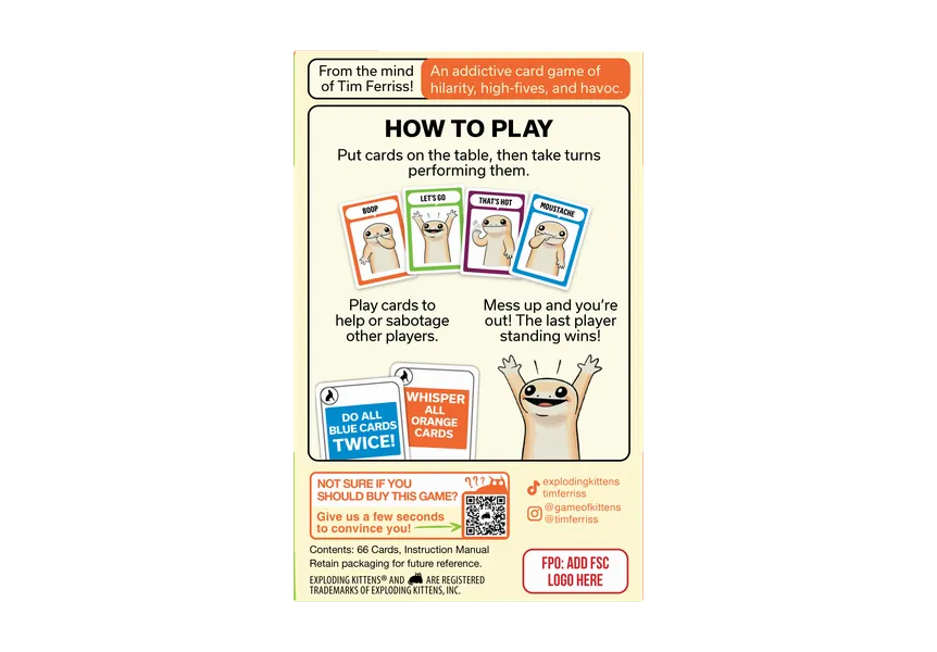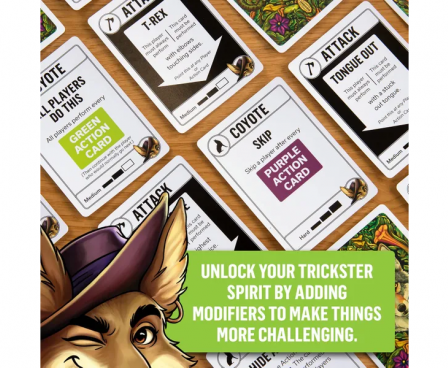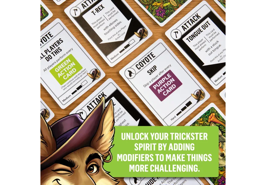 Each card has an action and a word. Lay out a line of cards and take turns, performing and saying each card. Add “coyote” cards to sabotage the other players and make the game harder. Mess up the sequence, and you're out.