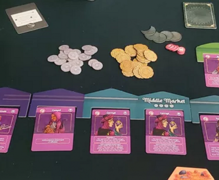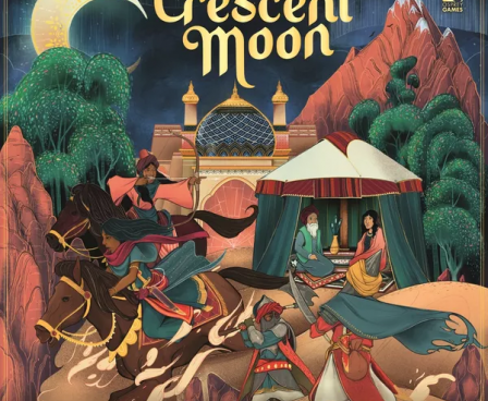 Crescent Moon is played over three years (or four years in the long game). Each year, players will take four actions which might be to deploy new armies, enlist mercenaries, build fortifications and settlements, conquer new land, expand their influence, and much more. Each character has a unique pool of abilities and available actions, which will shape their game, whether its the Sultan, who cannot raise their own army and must depend on mercenaries, or the Murshid, who can use their political influence to interfere in other characters' battles. Players can purchase potent power cards, representing ploys, wise advisors, and specialist units from a market shared between all players. At the end of each year, players score points according to their own unique character objectives, and at the end of the game, the player with most points wins.