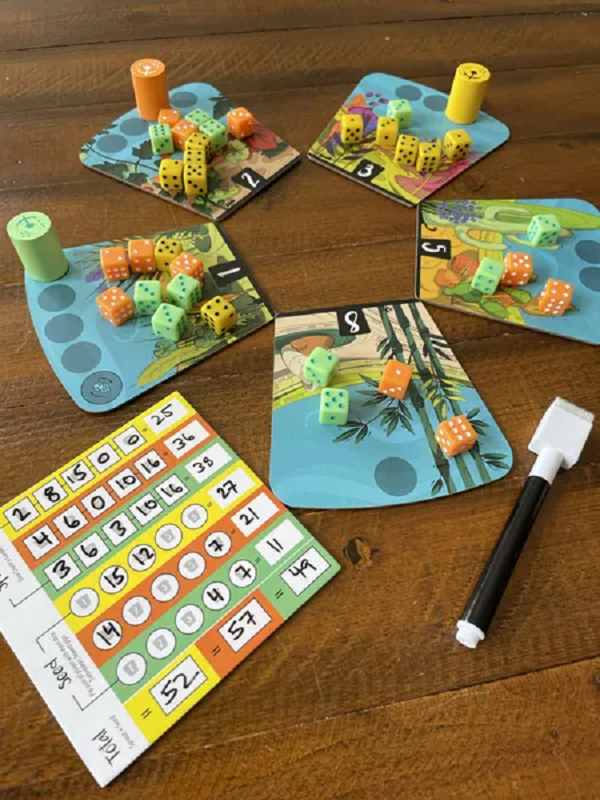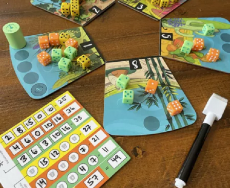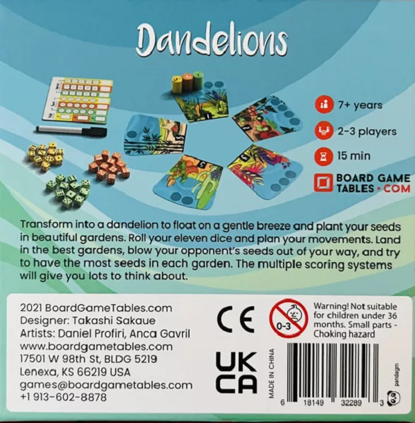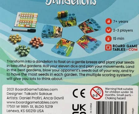 In Dandelions, players roll a group of dice, then choose one to move to a beautiful garden. Along the way, you can harness the power of the wind with three special actions — float, puff, and gust — to get the most points. The game ends after all the dice are used, and whoever receives the most victory points as combined from two different scoring methods wins.