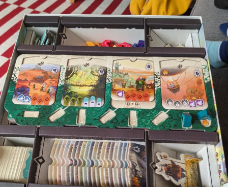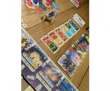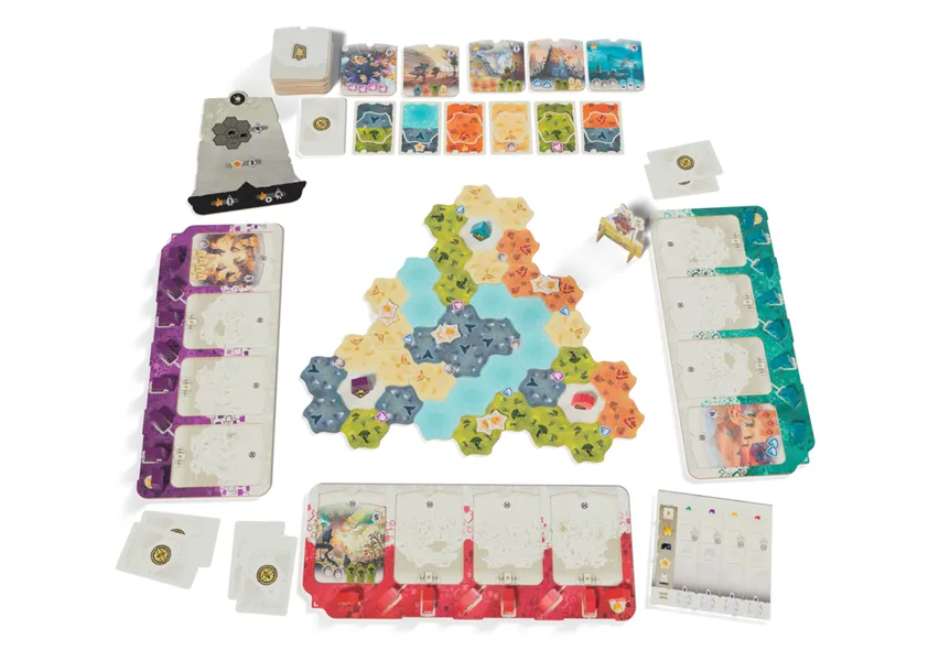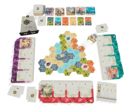 Dewan is a fast-paced, competitive area-placement game for 2-4 players that features racing, placement, and hand strategy. During play, you collect terrain cards and spend them to strategically place your camps on the territory. Make the best use of terrain and resources so that you can satisfy the requirements on your story tiles. Along the way, gather berries and master fire to earn additional points.