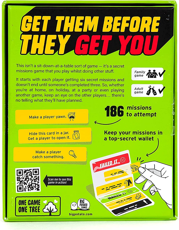 Mission examples include getting a player to compliment your hair, hiding this card in a jar and getting another player to open it for you;, and making up a word and getting a player to ask what it means.
