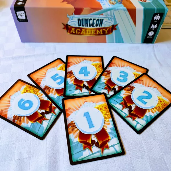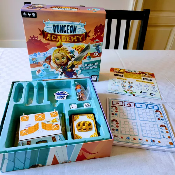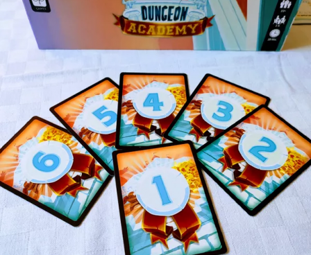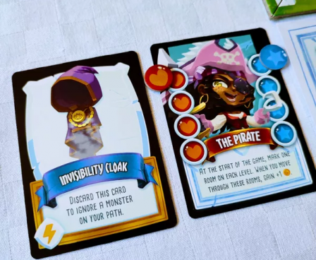 In Dungeon Academy, each player has a piece of paper that shows four dungeons, with each dungeon being a 4x4 grid. The game lasts four rounds, and in each round you will go through one of these dungeons. Each player also has a character card that shows some amount of life (red) and mana (blue) along with a special power.