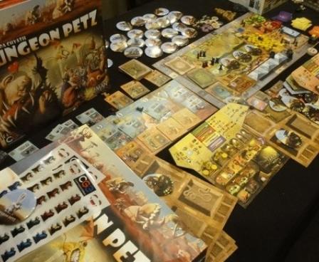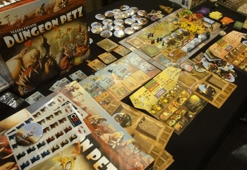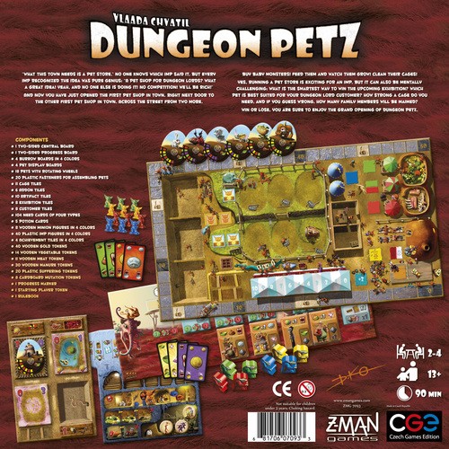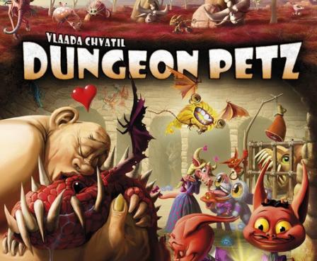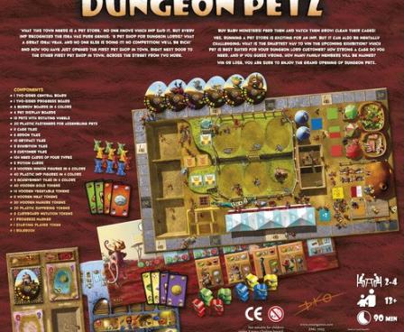 Dungeon Petz is a standalone game set in the Dungeon Lords universe. The game consists of several rounds in which players use unusual worker placement mechanisms (players simultaneously prepare different sized groups of imps in order to play sooner than others) to prepare themselves for the uneasy task of raising creature cubs and pleasing their different needs (represented by cards) in order to sell them as grown and scary creatures to Dungeon Lords. In the meantime, they also attend various contests in which they show off their pets, scoring additional points.