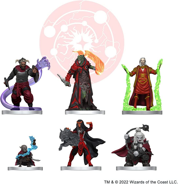The Red Wizards Faction Pack expands your games of D&D Onslaught with a scheming and nefarious faction comprised of powerful spell casters and their martial allies. The Red Wizards have a number of characters capable of summoning minions like skeletons and shadowy hounds to their aid. Summoned creatures are represented by tokens, but could also be represented with miniatures bought separately from WizKids' D&D miniature lines.