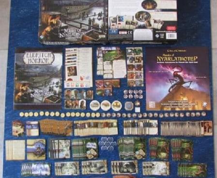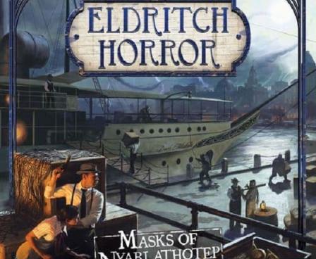 Eldritch Horror: Masks of Nyarlathotep is an expansion for Eldritch Horror, a cooperative board game for one to eight players in which intrepid investigators must traverse the globe in an attempt to thwart the cataclysmic rise of an otherworldly Ancient One. Strange cults are gathering strength in remote corners and bustling cities all over the world. Though they seem to worship different gods, the investigators have found a thread that runs throughout all of the cultists''' horrific rites.