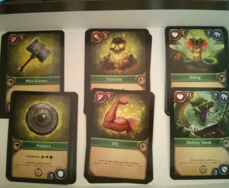 To set up the game, each player takes five crystals, then you shuffle together as many kingdom decks as the number of players, then lay out six cards (either items of enchantments) on the journey track. In the game, players take turns to embark on quests, collecting cards from the journey track by paying with crystals. Acquired cards are placed into adjacent stacks, with something like "Long Sword" going into the item stack and cards like "of Fire" going into the enchantment stack; combined, these cards create the "Long Sword of Fire", and cards grant both temporary bonuses (upper icons and skills) and permanent ones (bottom icons).