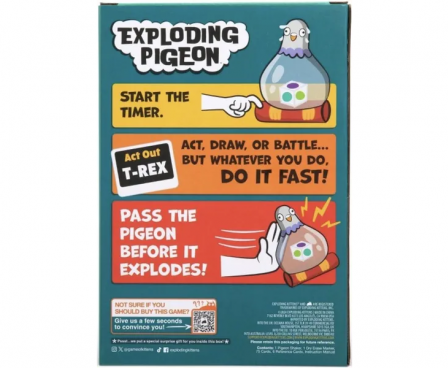 Exploding Pigeon is a little like Pictionary, a little like Charades, a little like a hot potato, and a LOT of chaotic fun! Exploding Pigeon is the rapid-fire challenge passing family game that'll change your parties forever. Shake the Pigeon to reveal your hilarious challenge -- it could be drawing, miming, or a quick round of rock, paper, scissors. Hurry and do it before passing the Pigeon to the other team! Scramble to complete as many challenges as you can, just don't get caught with the Pigeon when the timer runs out!